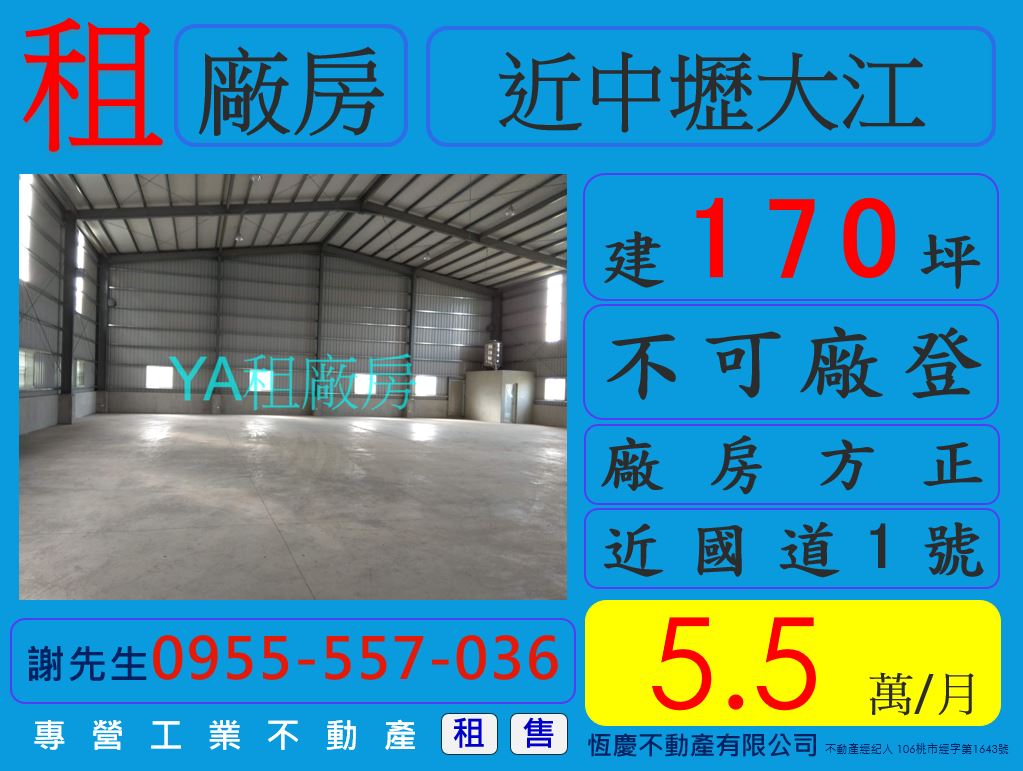 租中壢大江 廠房倉庫【約170坪】 不可廠登 租5.5萬 請洽0955-557-036謝先生