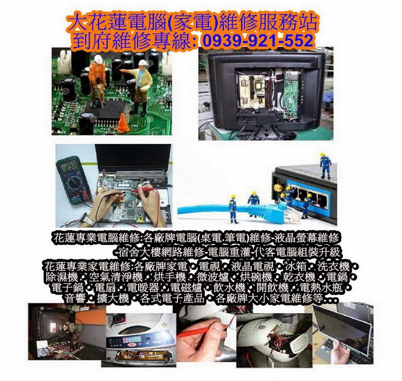 花蓮市花蓮縣電腦/家電/網路/筆電維修電話:0939-921-552冰箱洗衣機冷氣維修修理 電話:0939-921-552各式家電電腦維修-大花蓮電腦家電網路維修站 到府維修電話:0939-921-552