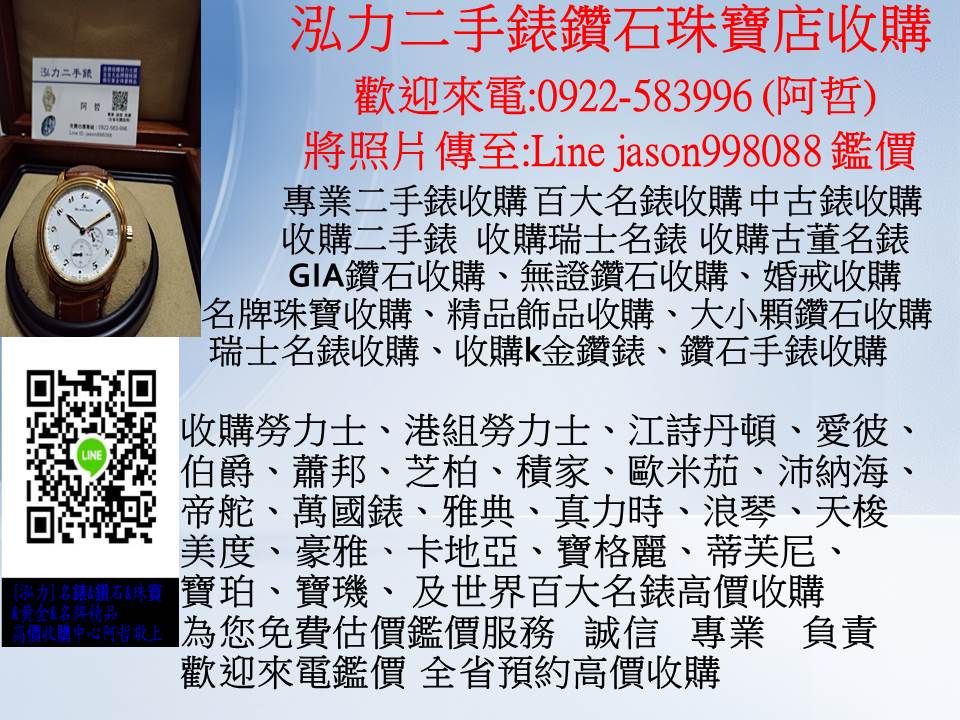 ROLEX錶收購、收購OMEGA錶、收購TISSOT錶、收購TUDOR錶、收購PENERAI錶、收購LONGINES錶、收購Cartier錶、收購PIAGET錶、收購IWC錶、 0922583996 阿哲LINE ID jason998088 泓力二手錶珠寶 百大名錶收購 勞力士錶收購、收購寶珀錶、收購寶璣錶、收購格拉蘇蒂錶、收購伯爵錶、收購蕭邦錶、收購芝柏錶、收購積家、收購百年靈、收購格林漢、收購歐米茄錶、收購帝舵錶、收購沛納海錶、收購萬寶龍錶、收購IWC萬國錶、收購浪琴錶、收購美度錶、收購天梭錶、收購真力時錶、 收購波爾錶、收購豪雅錶、收購豪利時錶、收購雅典錶 收購愛寶時、收購沛納海錶、收購寶齊萊錶、收購蒂芙尼錶、收購卡地亞錶、收購香奈兒錶、收購寶格麗錶、收購路易•威登錶、收購愛馬仕錶、收購星辰表錶、收購雷達錶、收購精工錶錶、蘇黎世鑽錶手錶 收購二手錶ROLEX、港製勞力士收購、K金手錶收購 機械腕錶收購、石英錶收購、珠寶手錶收購、收購古董鐘錶、收購積家空氣鐘 代客贖回當鋪手錶、代客贖回當鋪珠寶鑽石、黃金收購、白金收購 高價珠寶收購回收 鑽石,鑽石鑽戒,鑽石手鍊,鑽石項鍊,鑽石手環、k金戒指,線戒鑽石、紅寶石,藍寶石、 收購珠寶、鑽石收購、收購Tiffany鑽戒,卡地亞鑽石珠寶 收購BVLGARI珠寶、 收購卡地亞(Cartier) 收購寶格麗(Bvlgari) 收購蒂芬妮 (Tiffany & Co.) 收購伯爵(Piaget) 收購格拉夫(GRAFF) 收購梵克雅寶(Van Cleef & Arpels) 收購戴比爾斯(DE BEERS) 收購戴瑞(Darry Ring) 收購海瑞溫斯頓(Harry Winston) 收購寶詩龍(BOUCHERON) 收購戴瑞(Darry Ring) 收購蒂爵(DERIER) 收購德米亞尼(Damiani) 收購御木本(MIKIMOTO) 鑽戒,鑽石,手鍊,項鍊,k金戒指,收購精品,收購名牌鑽石鑽戒,收購GIA鑽石,線戒鑽石,收購鑽石,收購鑽戒,收購鑽石戒指,收購鑽錶,收購鑽石項鍊、收購鑽石價格,鑽石估價,收購鑽石珠寶,收購鑽石真品,鑽石買賣,回收鑽石,鑽石回收 專營鑽石飾品珠寶k金回收,沒有在帶的飾品k金,放著又沒用想變現嗎?一律現金高價回收不論為無證鑽石,GIA,HRD等...國際證書一律可以回收,或小至小碎鑽的小飾品都可以回收 高價收購專線:0922-583-996 阿哲 泓力二手錶珠寶收購 全省皆可服務 LINE ID : jason998088 ~傳圖片,馬上為您估價~ WeChat ID : jason998088 ~傳圖片,馬上為您估價~ 為您免費估價鑑價服務。 誠信 專業 負責 ~~歡迎來電洽詢~~