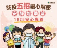 緩解心理壓力五大招 安:勤洗手、戴口罩、保持社交距離,以策安全。 靜:適量閱讀疫情新聞,保持平靜,減低焦慮。 能:多運動、充實防疫知識,厚植對抗疫情的能力。 繫:利用網路或電話維持聯繫,支持鼓勵。 望:保持希望,抱持疫情終會過去的正向能量。